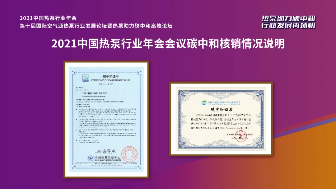 自去年9月,习近平总书记在第七十五届联合国大会上首次提出“碳达峰、碳中和”目标以来,“碳达峰、碳中和”迅速成为中央高度重视的国家战略,并逐步渗透到社会生产生活的各个领域。经中国质量认证中心碳核查,2021中国热泵行业年会所产生的229吨二氧化碳当量的温室气体,会议主办方通过在购买并注销等量中国核证自愿减排量CCER完成抵消,实现了本次大会活动的碳中和。